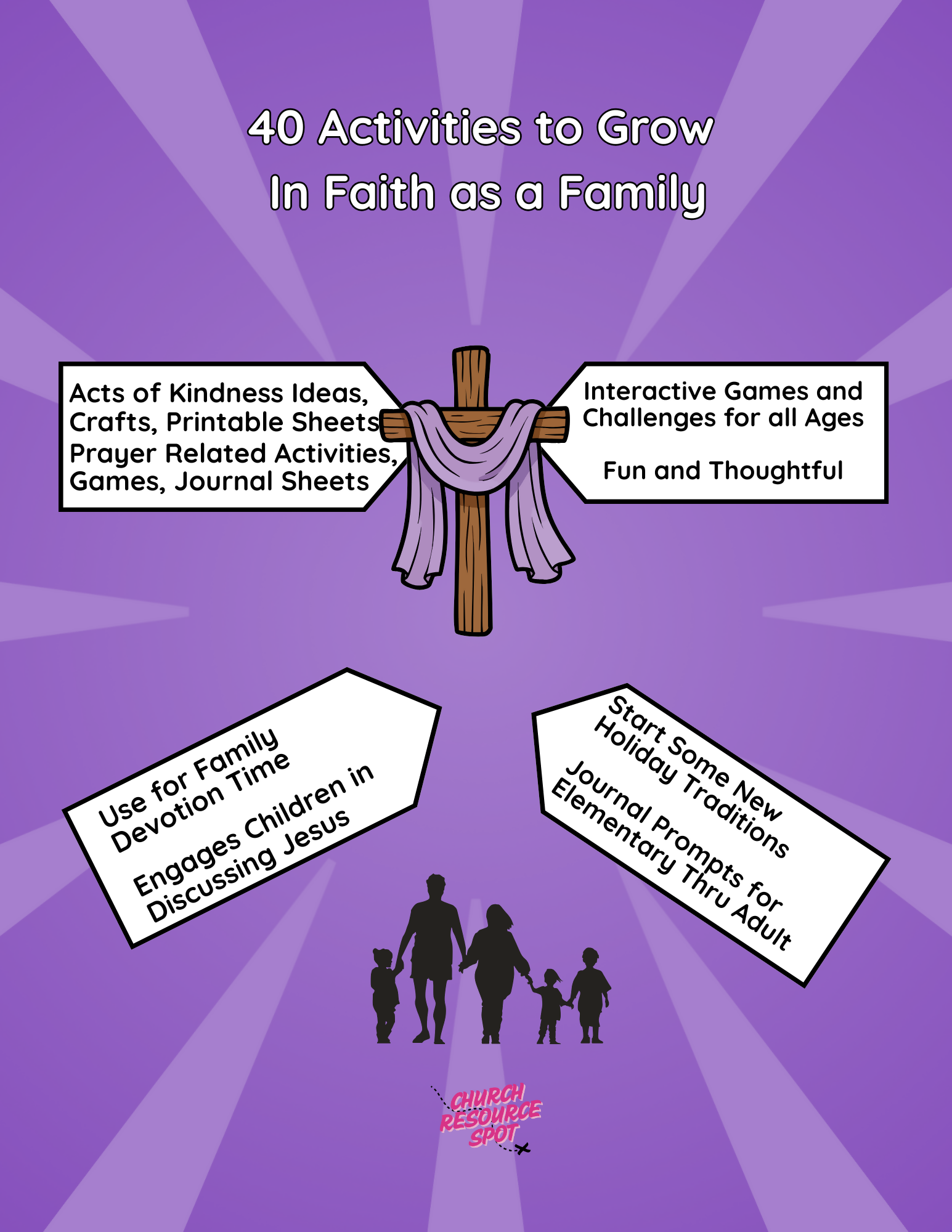 40 activities focus on prayer, doing kind things, family games, crafts, and faith-based activity sheets. Plus 4 bonus activity cards and 4 blank cards to write in any family traditions.