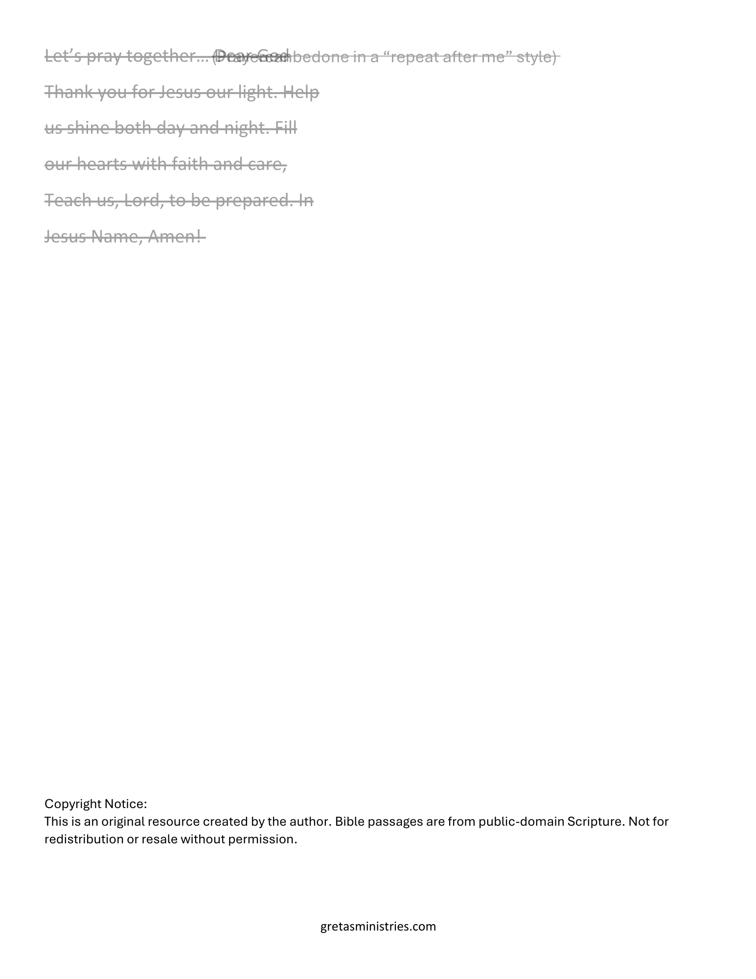 Key Takeaway: Jesus calls us to “Be Prepared” by keeping our faith strong and our light shining. When we stay close to Him through faith, prayer, and trust, we are ready—no matter when He returns.