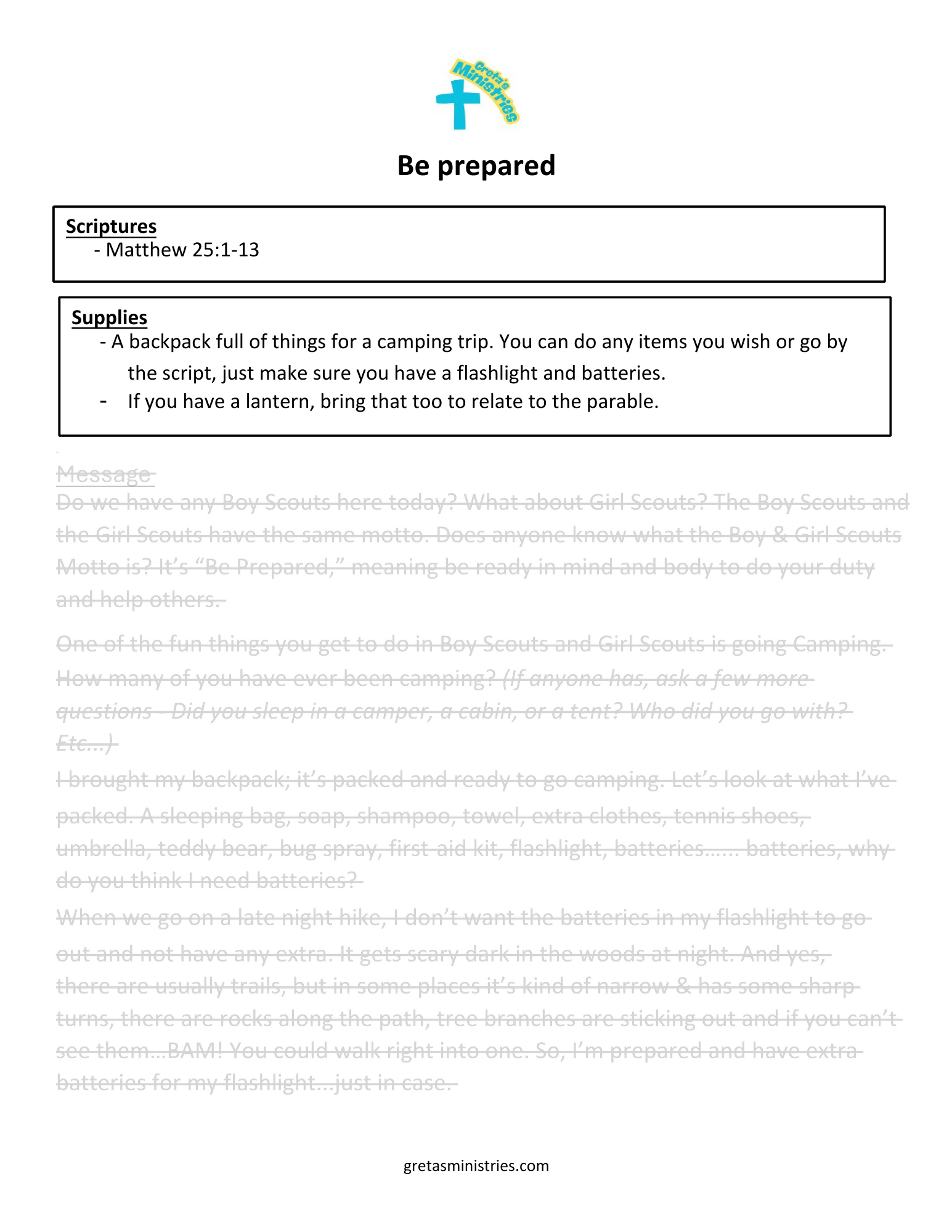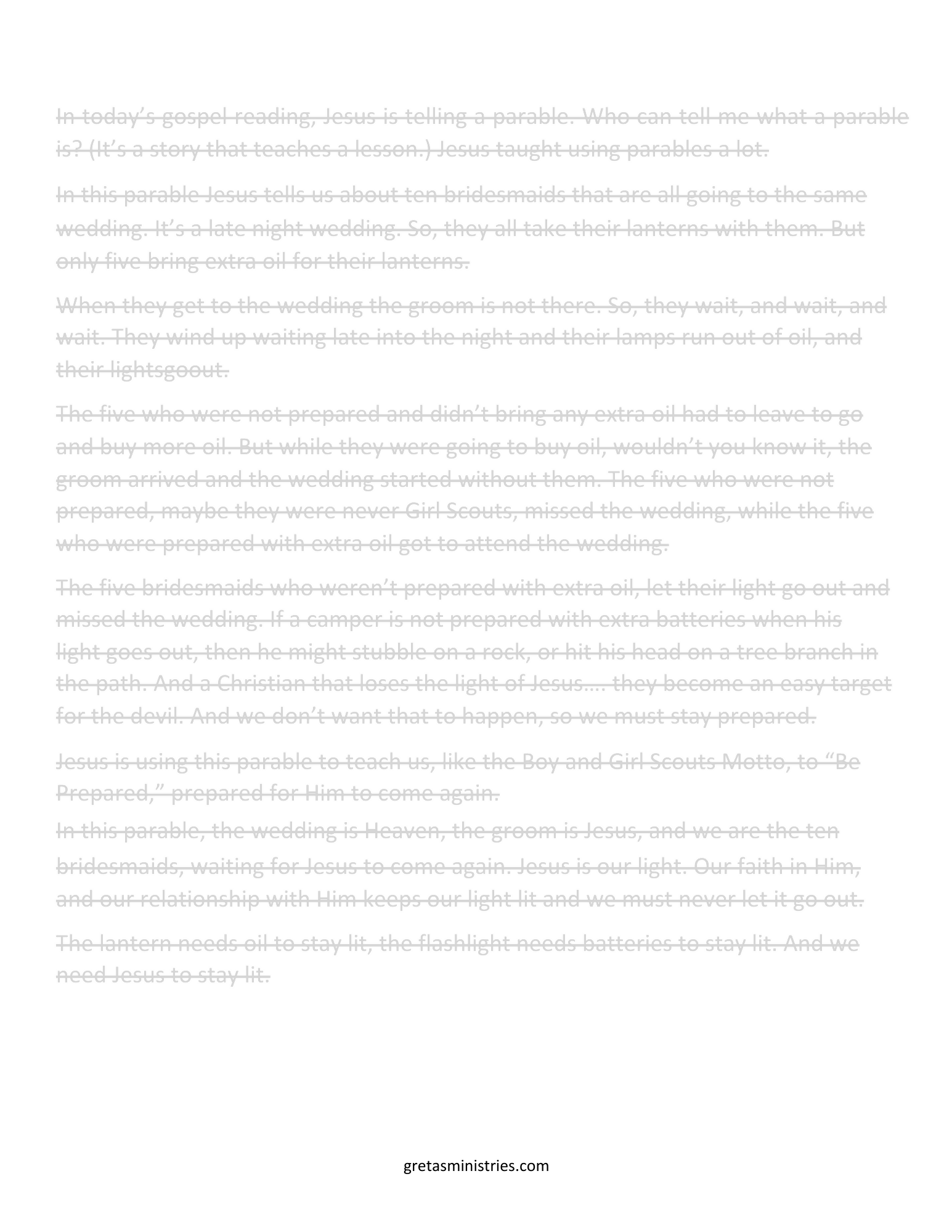 This children’s message uses a camping and flashlight object lesson to help kids understand Jesus’ parable of the ten bridesmaids and what it means to be spiritually prepared. By connecting the Boy and Girl Scouts’ motto “Be Prepared” with everyday experiences like camping, lanterns, and extra batteries, children learn how faith in Jesus keeps their light shining.