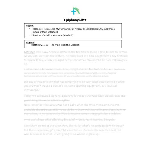 This children and youth message/sermon begins with a story about a child who received a costume for Christmas, a gift that may hint at what he might become one day. (picture is included or use one of your own.) This connects to the story of Epiphany.