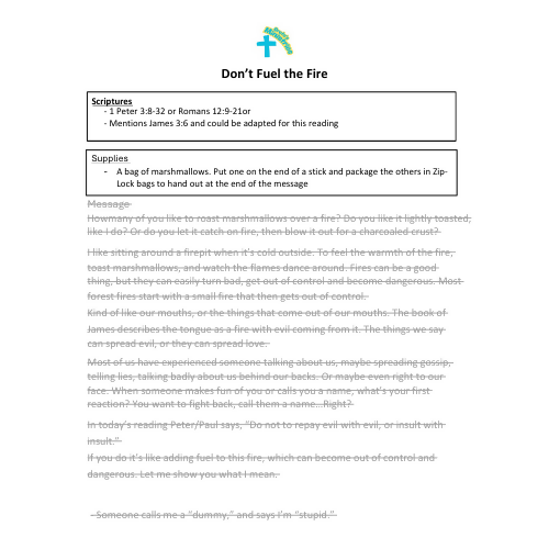 Children & Youth sermon/Lesson - Don’t Fuel the Fire (1 Peter 3:8-32 or Romans 12:9-21)