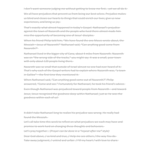 This sermon for all ages explores what it means to be prejudiced—to “pre-judge” someone before we know them. Using the story of Nathanael and Philip from the Gospel of John, kids learn how Nathanael’s snap judgment about Nazareth almost caused him to miss meeting Jesus! Through humor, honesty, and real-life examples, children discover that prejudice blinds us, closes our hearts, and keeps us from the gifts God wants to give us. Jesus shows us a better way—to look deeper, treat everyone the same, and respond with the invitation Philip gave: “Come and see.”
