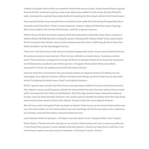 In this children’s sermon, kids explore all the different reasons people cry—from scraped knees to sad movies, from onions to losing someone we love. Then they learn that Jesus cried too!