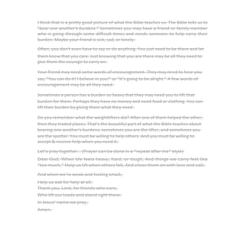 Key Takeaway: God calls us to help lift others when life feels heavy—and to accept help when we need it. We are stronger when we care for one another the way Christ cares for us.