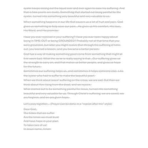 Just as an oyster turns irritation into a valuable pearl, God uses life’s challenges to strengthen our faith and help us grow. Through relatable examples like time-out, being grounded, and everyday struggles, children learn that suffering doesn’t mean God has left us—it means He is at work.
