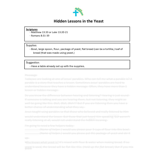 Through an interactive object lesson using flour and yeast, kids will explore how small things—like faith or the Kingdom of Heaven—can grow into something big and powerful. This lesson connects to Jesus’ parables and encourages kids to truly listen to God’s Word and understand His hidden messages of love, growth, and transformation.