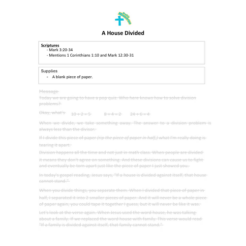 This engaging children’s sermon uses simple math division and a torn piece of paper to help kids understand how division works—not only in the classroom, but also in families, friendships, and the church. Jesus teaches that a “house divided cannot stand,” reminding us that arguments, conflict, and division tear people apart just like the ripped paper.