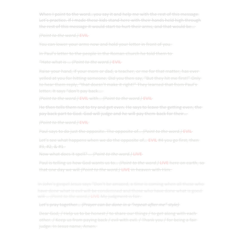 In this interactive, hands-on lesson, children learn the difference between good and evil and discover how God calls us to respond with love, honesty, and kindness — even when others do wrong. Using a fun word activity (“E-V-I-L” becomes “L-I-V-E”), kids see how living God’s way turns evil upside down!