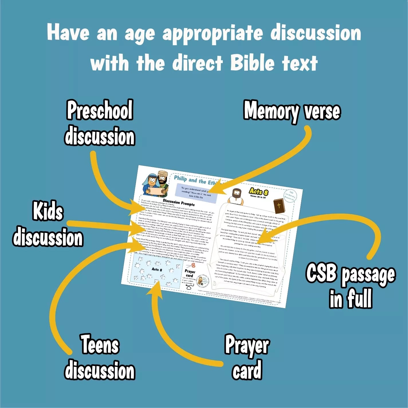 Learn about Philip meeting the Ethiopian and baptising him. Based on the passage in Acts 8. The lesson focuses on the ideas of how we form our faith, and how we can reach out to others. It includes two fabulous Bible crafts that can be used with any age, as well as a multi-age discussion guide.