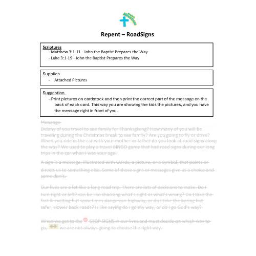 Through the story of John the Baptist (Luke 3:1–19) and the call to repentance, kids discover that repentance means making a U-turn—turning away from sin and back toward God.