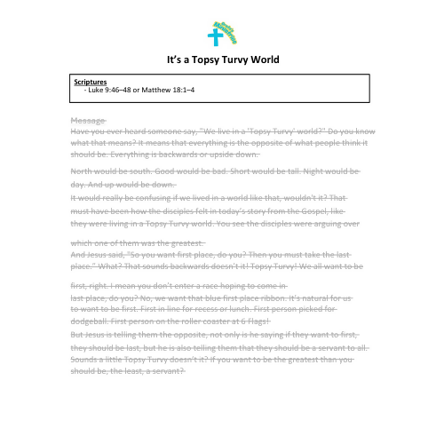 This children’s sermon helps kids understand one of Jesus’ most surprising teachings: “If you want to be first, you must be last and servant of all.” Using the fun and relatable idea of a “Topsy Turvy” world—where everything seems backwards—children quickly grasp how different Jesus’ way is from the world’s “me first” attitude.