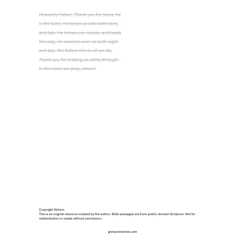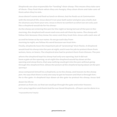 Through simple language and concrete examples, this lesson explains how Jesus gathers us together as a community, feeds and forgives us, calls us by name, and protects us from harm. The powerful image (picture included) of Jesus as the Gate helps children understand that Jesus laid down His life so we could be safe and have eternal life with God.