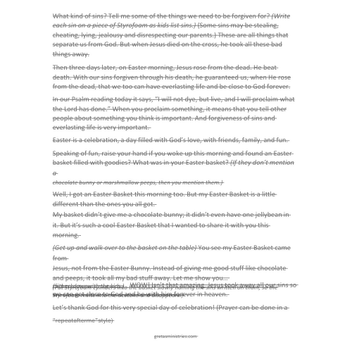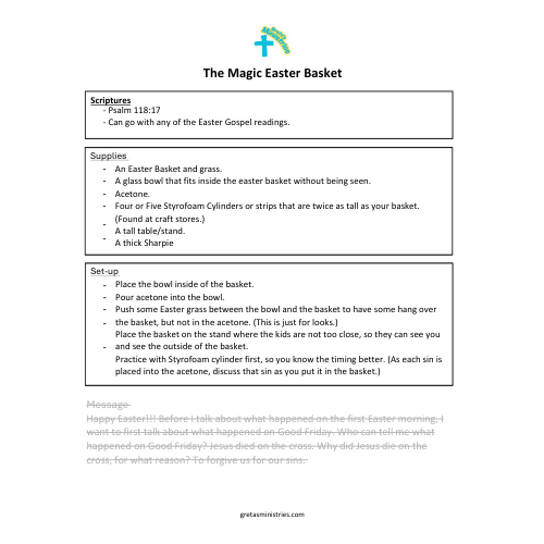The Magic Easter Basket is a fun, hands-on, interactive children’s sermon that clearly explains the meaning of Good Friday and Easter in a way kids can see, understand, and remember. Using an EASY Easter basket illusion, children learn how Jesus takes away our sins and replaces them with forgiveness, new life, and hope.