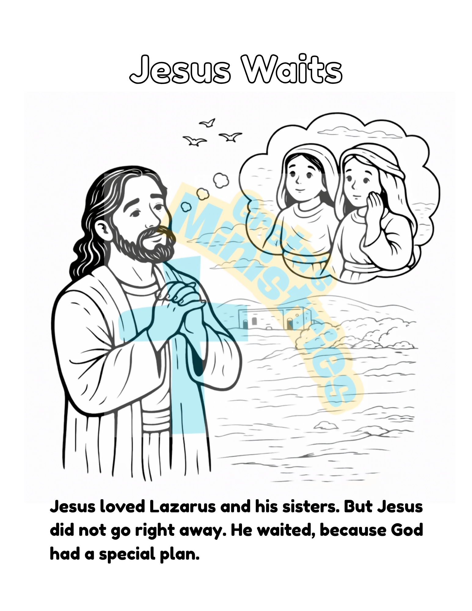 Help young children discover the Bible story of The Raising of Lazarus in a simple, gentle, and age-appropriate way. This preschool coloring book retells John 11 using short sentences, clear pictures, and familiar emotions children understand like sadness, love, hope, and joy.