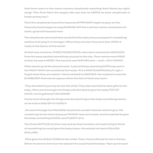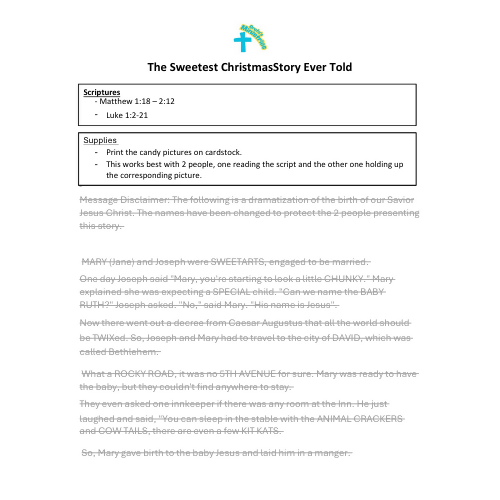 Looking for a fun, memorable Christmas children’s sermon, Nativity skit, or candy-themed Christmas program for children or youth? The Sweetest Christmas Story Ever Told is a lighthearted and engaging dramatization of the birth of Jesus using 40 popular candy bars and snack puns and joyful wordplay that kids absolutely love.